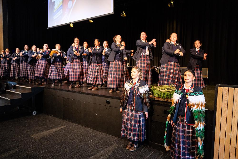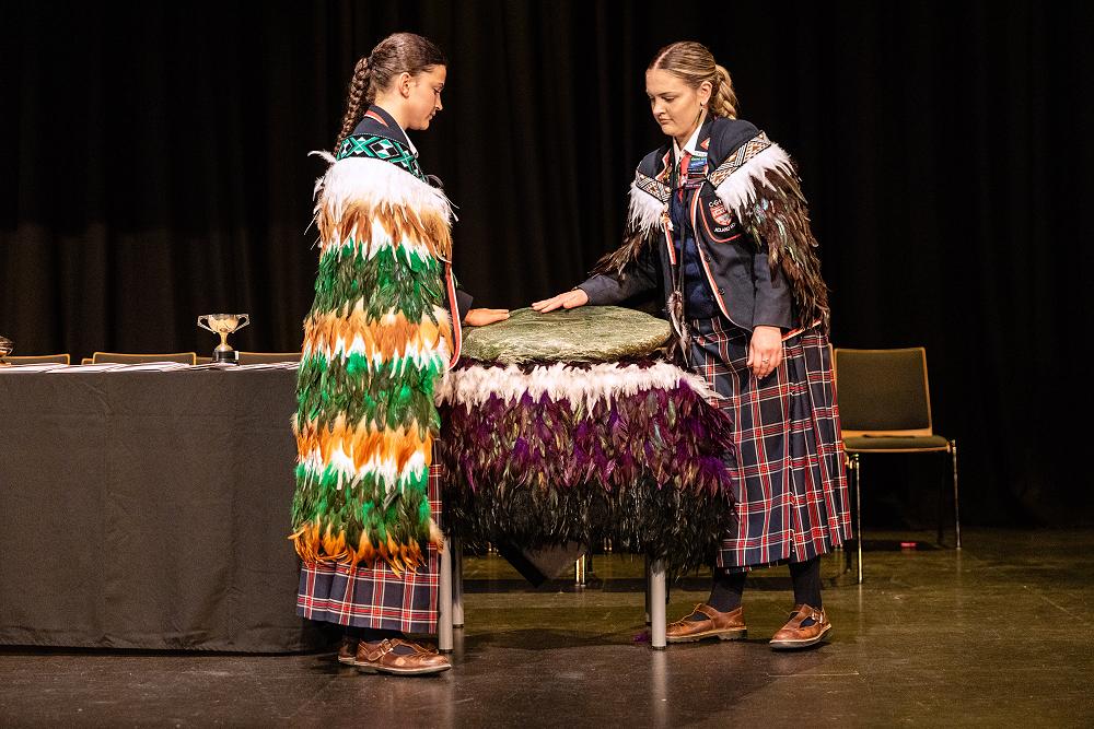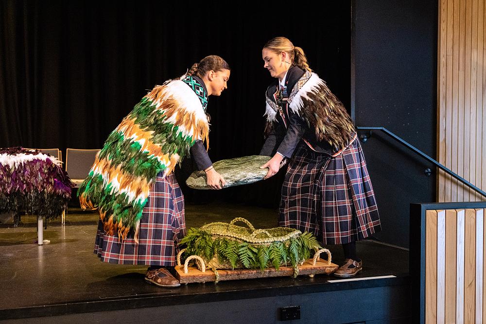 Finally, we want to invite anyone who walks across the stage tonight, particularly our yr 13s, to touch the pounamu as you walk past and put your mauri into the pounamu. As each of you connect with this stone, may its wairua grow stronger; carrying the stories, strength, and aroha of everyone who passes through our kura.
